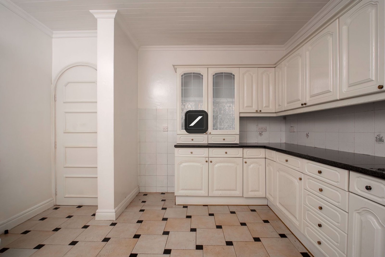 - Modern kitchen with granite countertops, tiled floors, and a spacious pantry