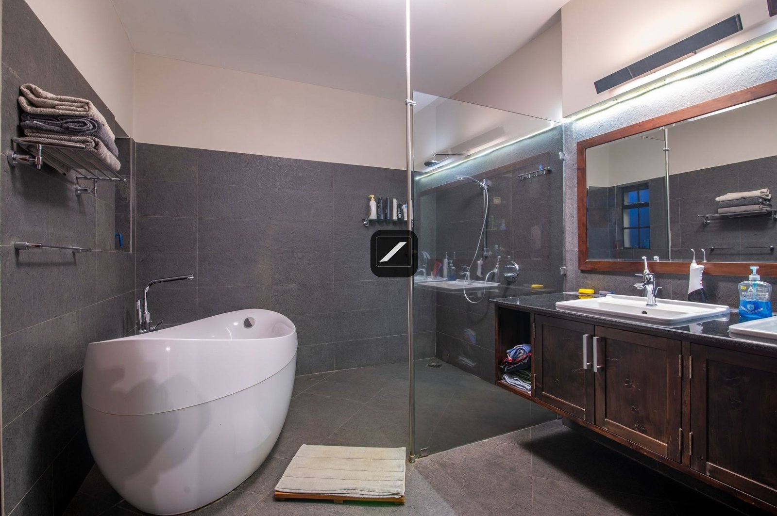 - Main bedroom with en-suite bathroom, double basin, bathtub, shower, and tiled floors