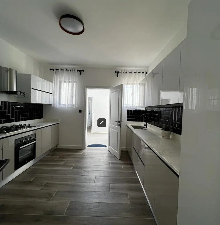 Closed kitchen plan fitted with a cooker,hood oven and pantry